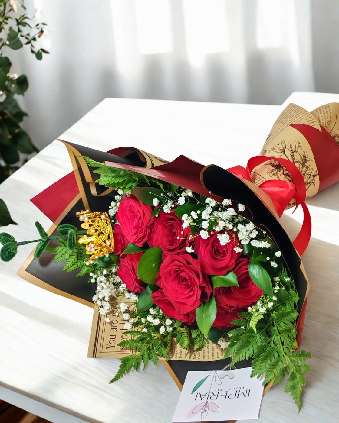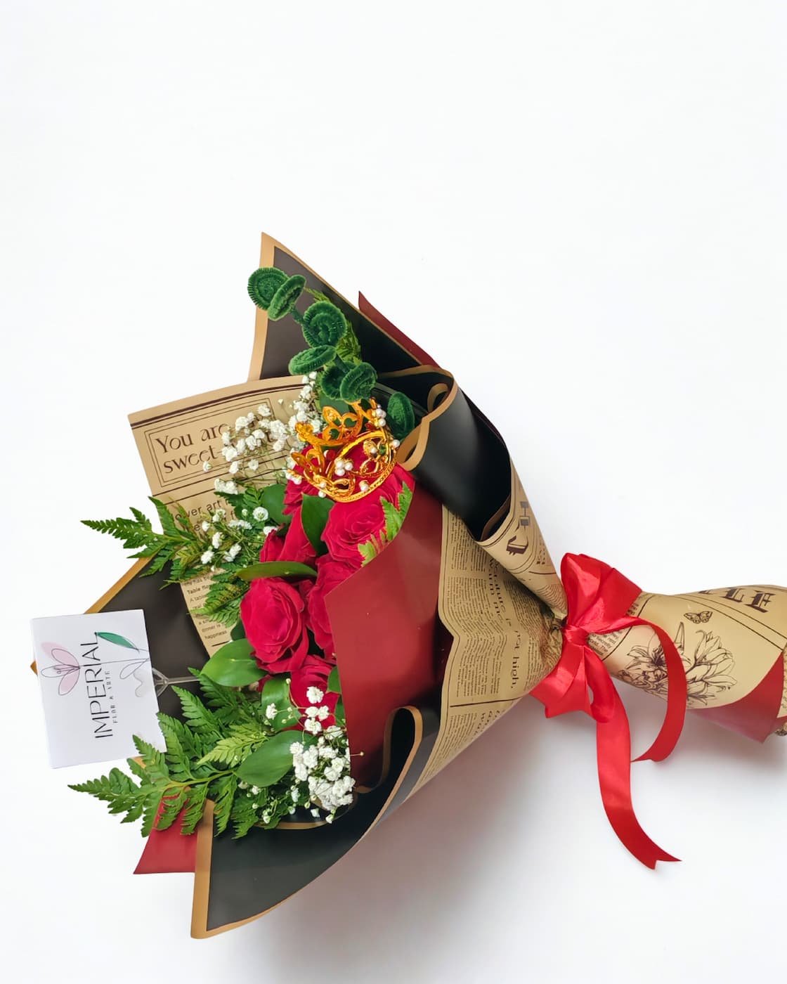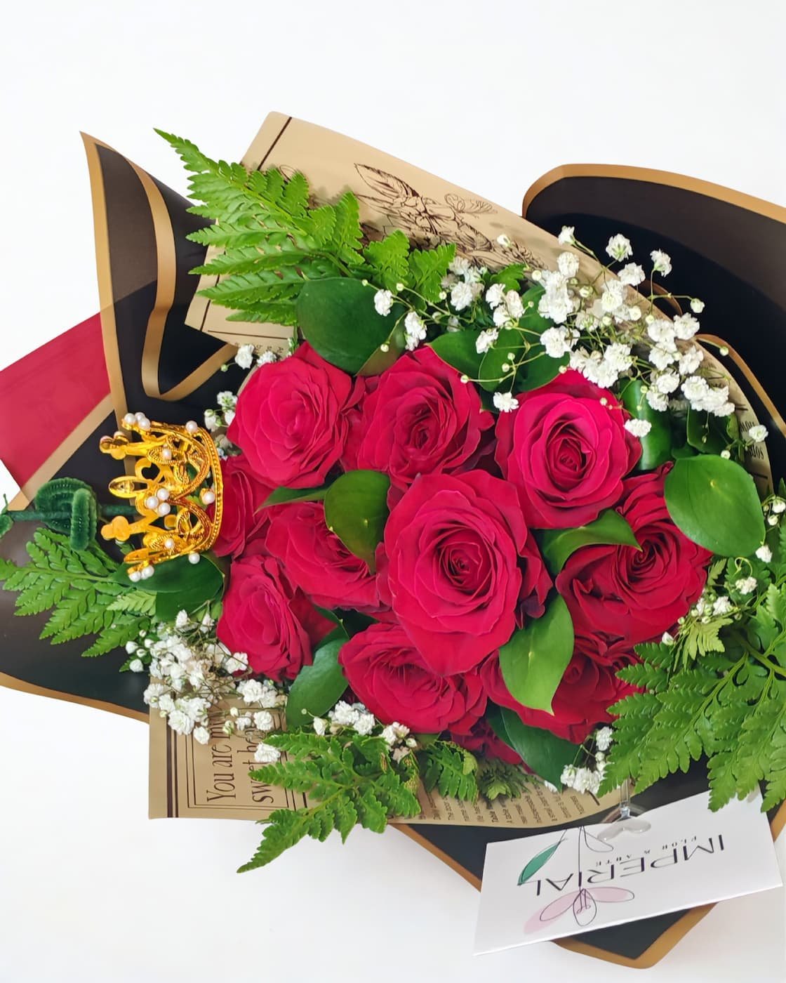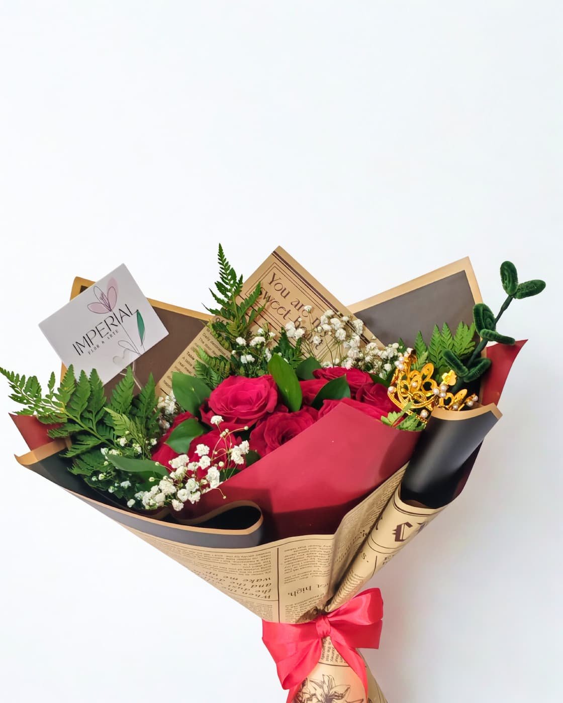 Su diseño se construye a partir de una base equilibrada de follajes verdes y delicadas flores blancas, que realzan la intensidad del rojo y aportan profundidad visual. Como sello distintivo, una corona decorativa corona la composición, simbolizando su lugar como uno de los arreglos más elegidos y apreciados por quienes buscan expresar amor con carácter.
