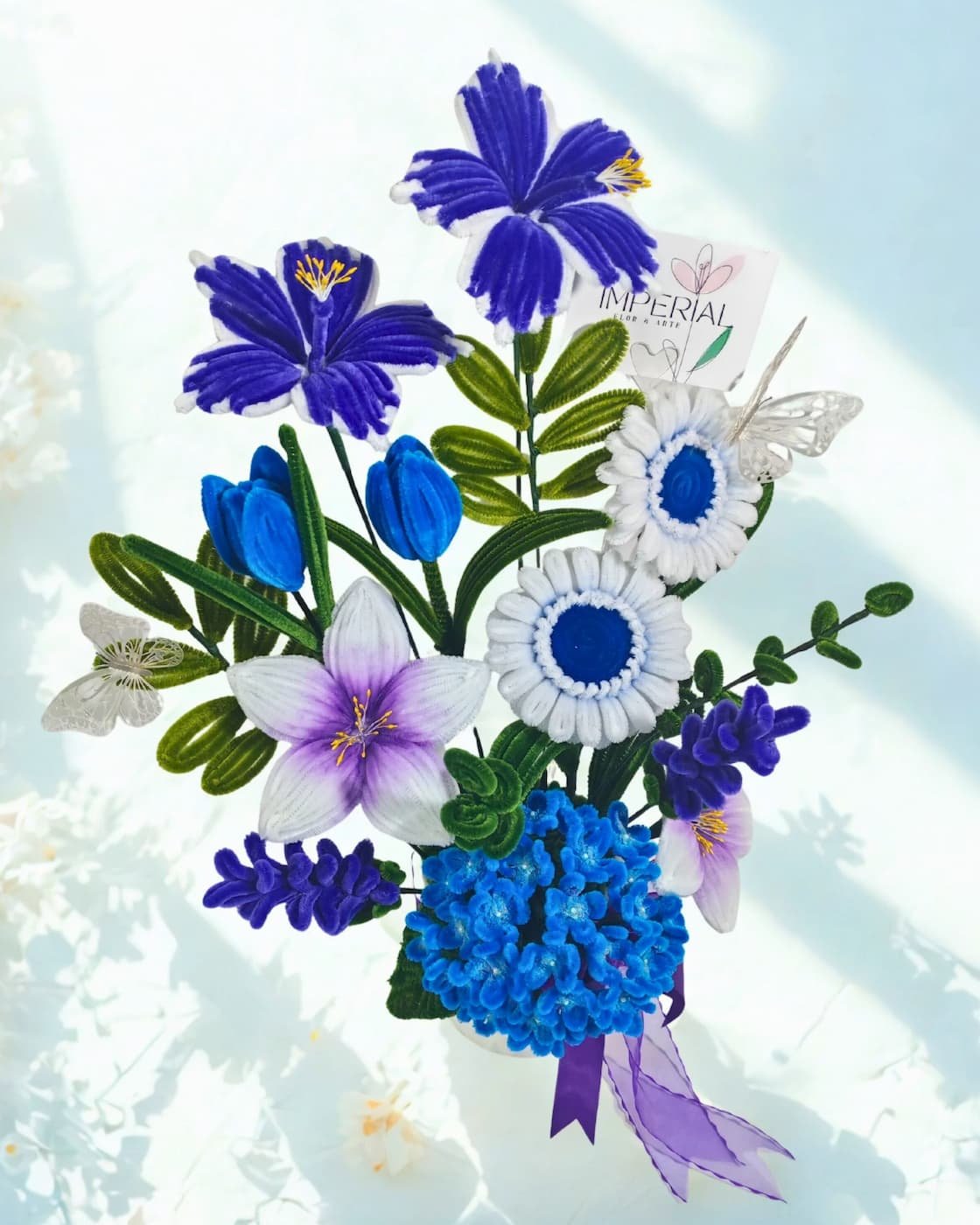 El protagonismo lo toma su imponente hortensia azul, una flor que destaca por la dedicación que exige cada uno de sus detalles, por su textura envolvente y por la paciencia que implica darle vida pétalo a pétalo. A su alrededor, las flores en tonos blancos, violetas y azules profundos dialogan entre sí con equilibrio, creando una composición armónica, elegante y profundamente contemplativa.