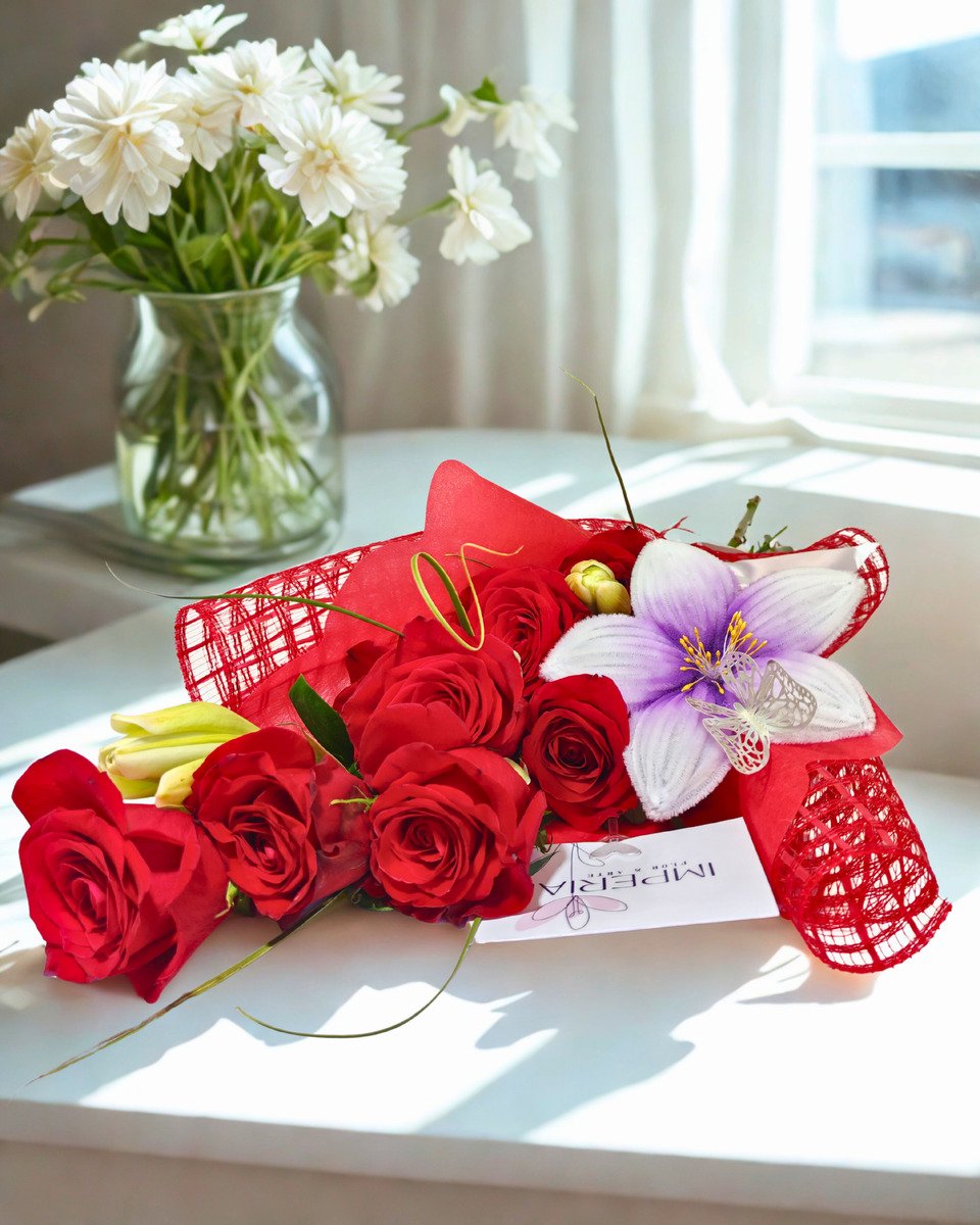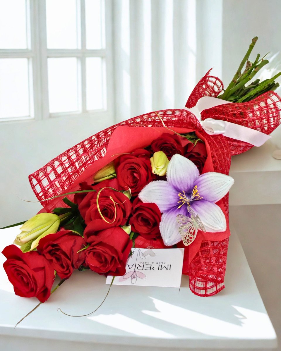 Combina 10 rosas rojas dispuestas con fuerza y equilibrio, acompañadas por lirios naturales que aportan altura, contraste y elegancia a la composición.